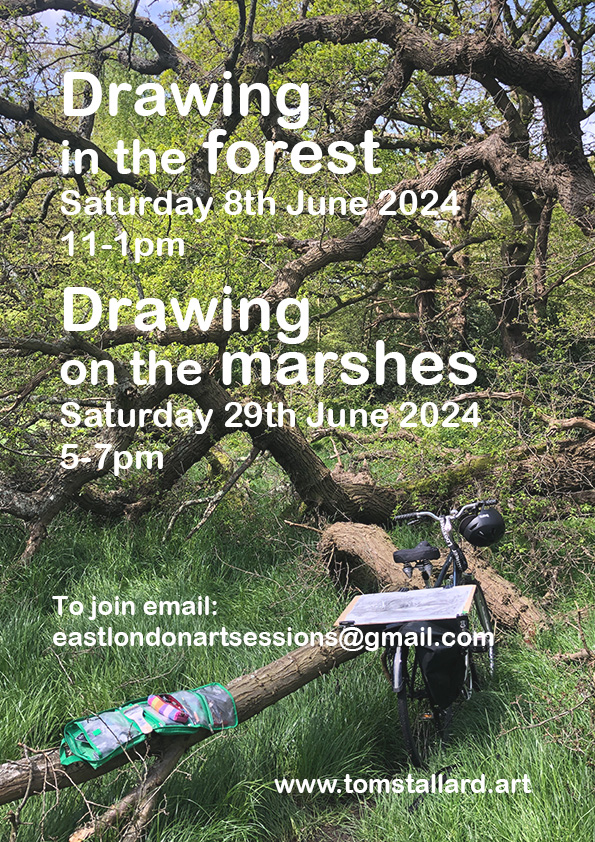 Two things in news this month! One is the E17 Art Trail, which is huge and vast and big and you’ll probably want to plan but why not visit me first before you become overwhelmed. I’ll be home for the most part at ‘Living Tree Space’ in venue #106 on the village trail. Which leads me on to my second news, drawing in the forest and drawing on the marshes, some details follow.